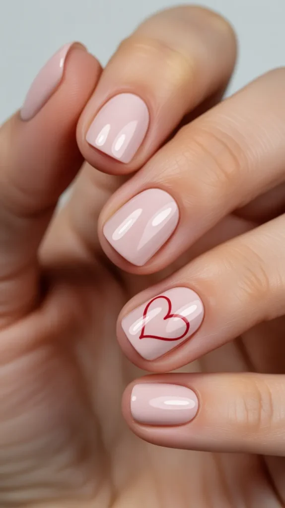 Heart outline nails are perfect for short nails because they look light and not crowded. Paint your nails a soft pink base, then draw a thin red heart outline on two or three nails. Keep the heart open in the center so it looks modern and clean. This style is great if you like minimal nail art but still want Valentine vibes.