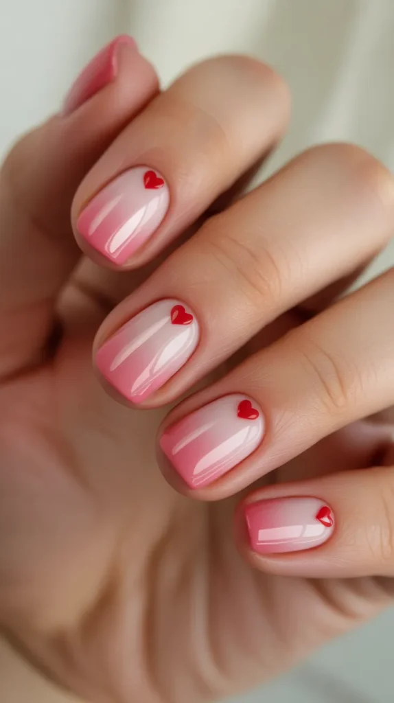 Pink ombre nails look soft and flattering on short nails because they add depth without needing extra length. Blend a pale pink into a deeper pink toward the tip, then add one tiny red heart near the cuticle on each nail. This creates a gentle Valentine theme that still feels stylish and modern.