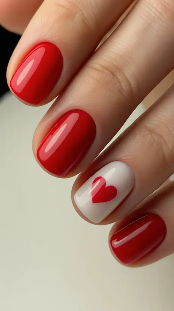 If you love bold nails but want something simple for short length, go for a solid red manicure with one pink heart accent nail. Paint most nails glossy red, then paint one nail pink and add a centered red heart. This creates a strong Valentine theme while keeping the design easy to do. It’s a great choice for photos and looks cute even on very short nails.