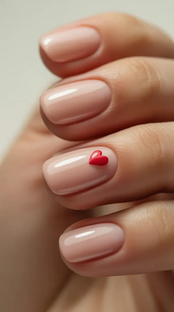 This is one of the easiest short Valentines Day nail ideas with heart designs because it looks clean and works on any short nail shape. Paint all nails in a nude pink or sheer blush shade. Then add one tiny red heart on the ring finger or thumb. The simple accent makes your manicure look polished without needing advanced skills. It’s perfect for school, work, or a casual Valentine dinner.