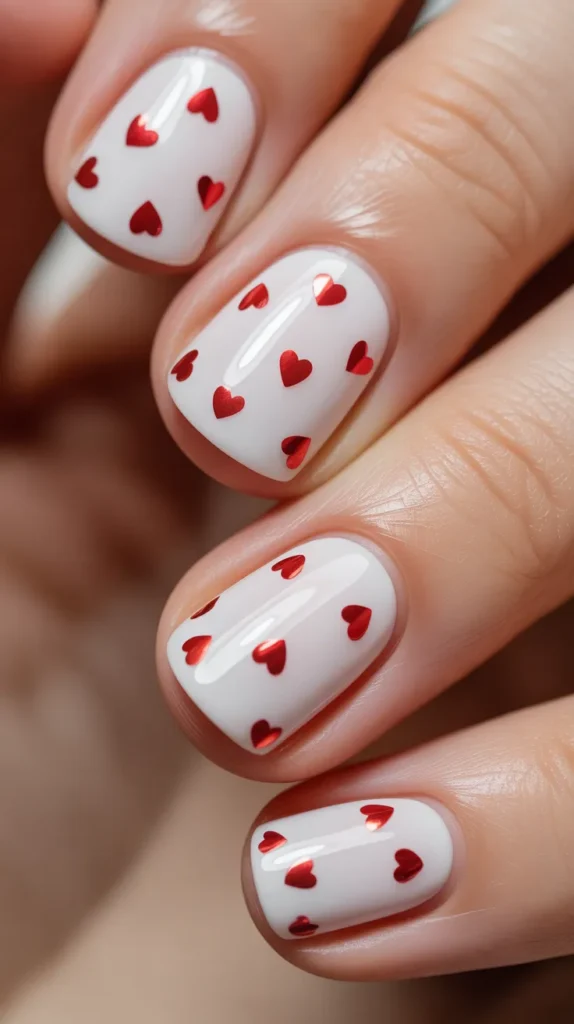 A white base makes heart designs stand out, even on short nails. Paint your nails solid white, then add tiny red hearts like confetti across each nail. You can keep the hearts random for a playful look or place them in a neat pattern. This design is cute, bright, and perfect for Valentine’s Day parties or photos.