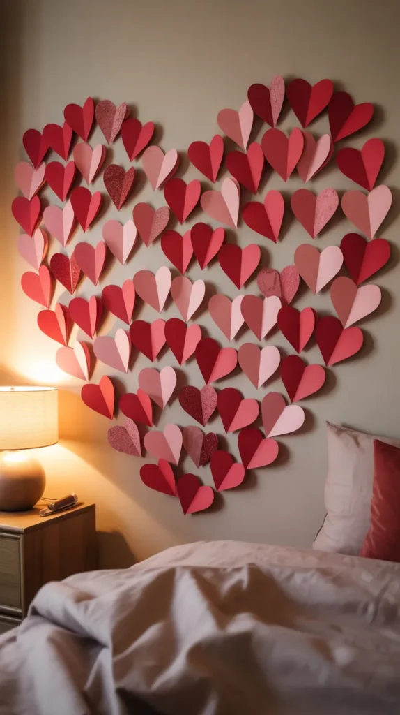 A DIY paper heart wall display is one of the most budget-friendly Valentine’s Day wall decor for bedroom ideas. You only need colored paper, scissors, and tape, which makes this a very affordable option. This is a smart way to save money while still creating something beautiful and personal. You can arrange the hearts in shapes like a big heart or scatter them across the wall for a playful look.