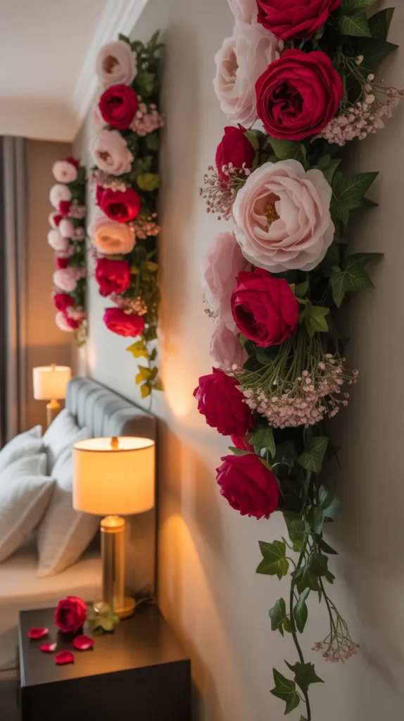 Floral wall hangings are a classic and affordable Valentine’s Day wall decor for bedroom ideas. You can choose artificial flowers, which are a smart investment because they last for many years. This helps you save money over time while still enjoying a beautiful romantic look. Hanging flowers on the wall adds softness and charm to the space.