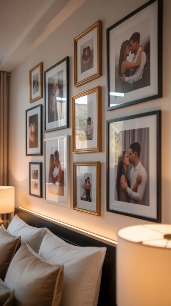 This idea gives strong value for money because the frames can be reused with different photos anytime. It is a cost-effective way to refresh your wall decor while keeping things emotional and personal. You can mix black-and-white and color photos for a stylish look. This makes your bedroom feel warm and romantic without a big budget.