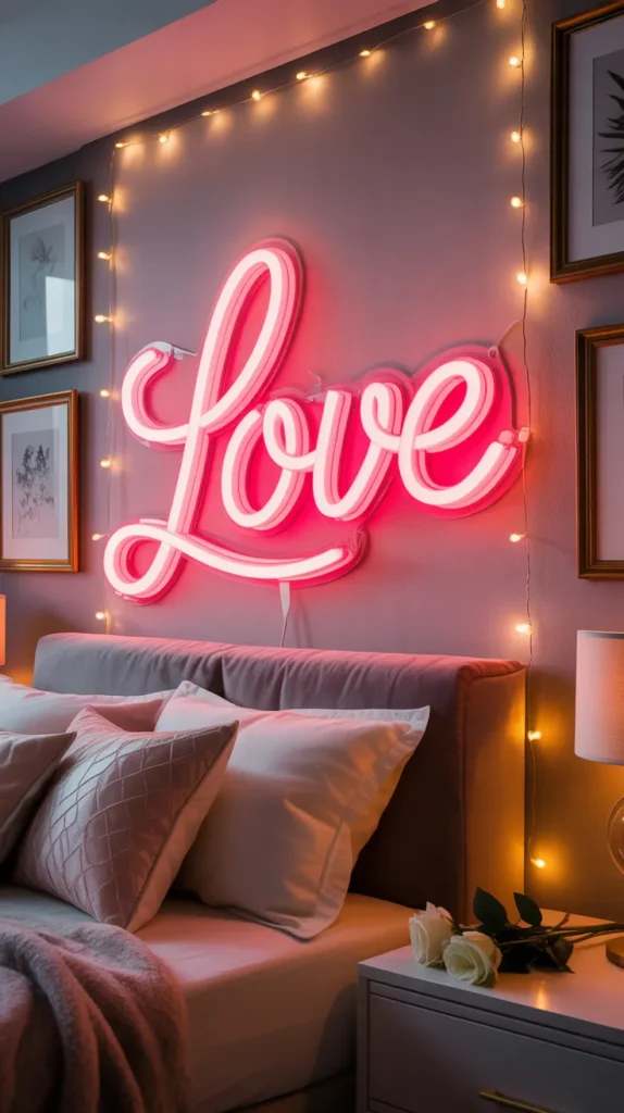 LED neon love signs are a trendy and affordable Valentine’s Day wall decor for bedroom spaces. These signs give a bright and modern look without the high cost of real neon. This makes them a smart purchase for couples who want a stylish touch. Many LED signs are energy-efficient, which helps save money on electricity.