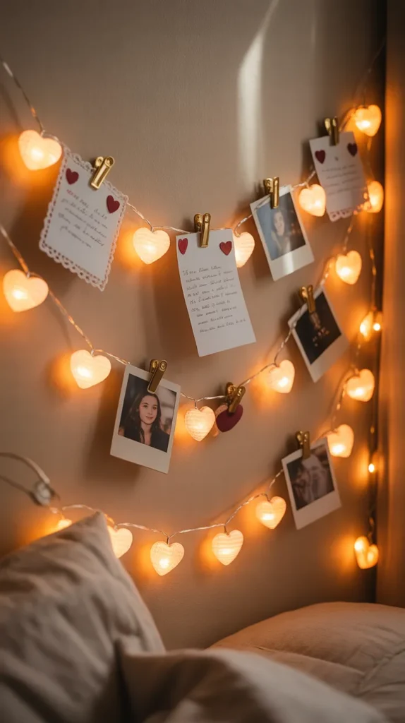String lights with heart-shaped clips are a popular and affordable Valentine’s Day wall decor for bedroom design. These lights allow you to clip photos, notes, or small cards to the wall, adding both light and emotion to your space. This is a smart purchase because it combines lighting and decoration in one simple product. It is also budget-friendly, as you can find many low-cost options online.