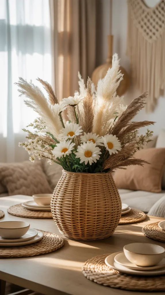 A small rattan basket filled with artificial daisies and pampas grass creates a relaxed boho vibe. This centerpiece looks beautiful on dining tables or round coffee tables.