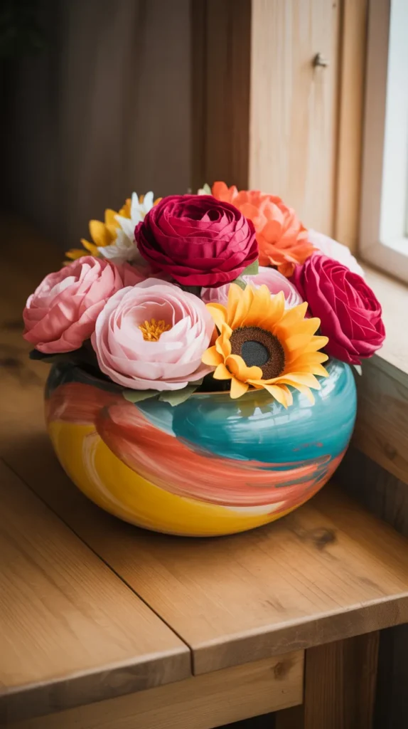 A bright ceramic bowl filled with mixed artificial blooms creates a fun and lively centerpiece. This works well in modern or eclectic homes.