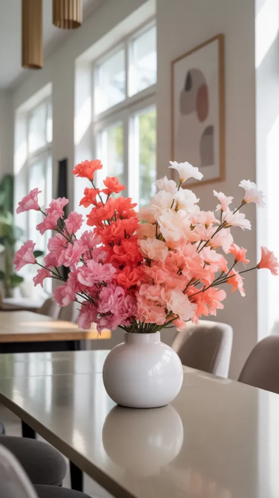 Create a whimsical ombre effect using artificial flowers in graduating shades, such as light pink to deep rose. Arrange them in a simple ceramic vase for a bold table statement.