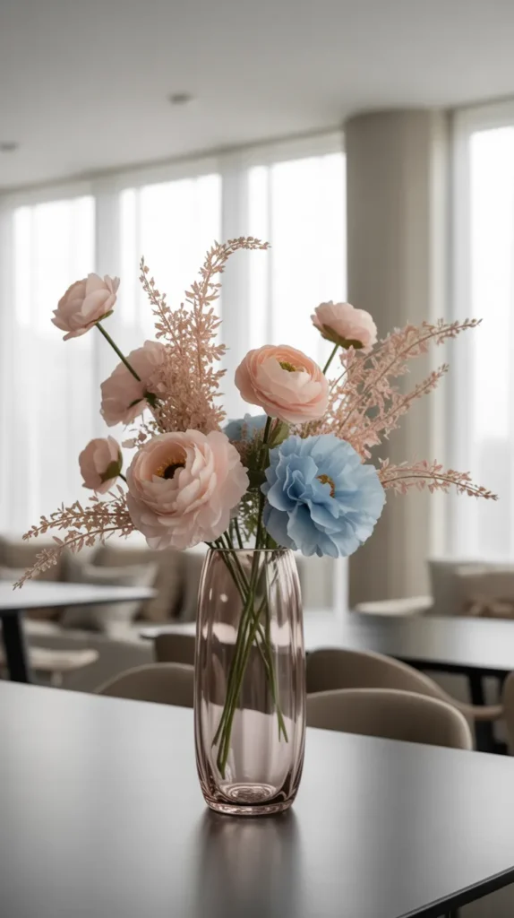 Choose a tall clear glass vase and fill it with mixed artificial blooms in unexpected colors like blush and soft blue. Add curved stems for a whimsical touch.