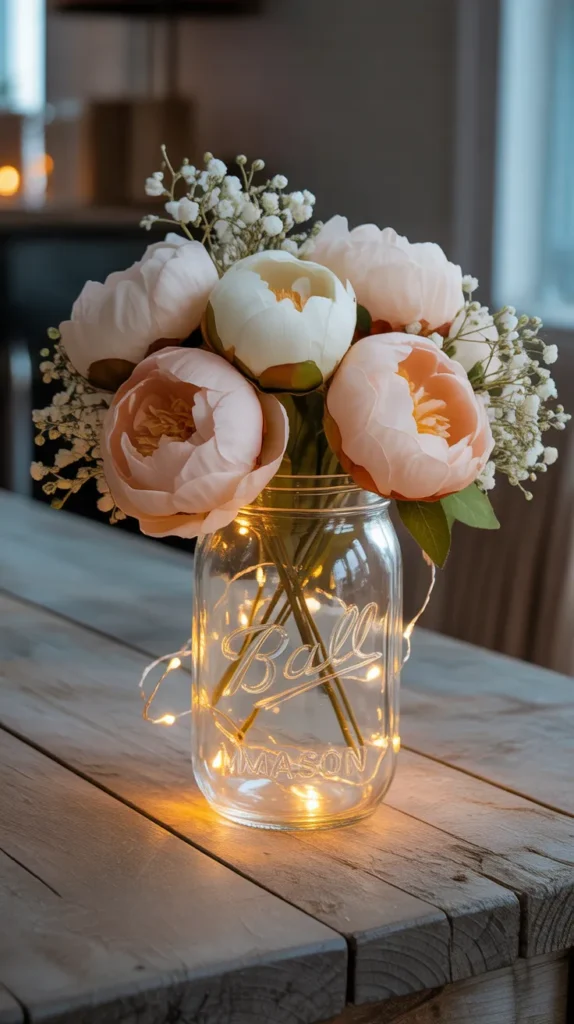 Mason jars filled with artificial flowers and tiny string lights create a magical, fairy-inspired centerpiece. Choose soft pink, cream, or lavender blooms for a dreamy look. This works beautifully for dinner parties or cozy home settings.