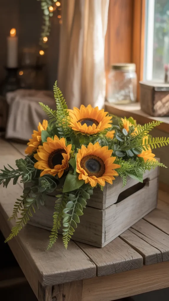A small wooden crate filled with faux sunflowers and greenery creates a cheerful farmhouse look. It’s perfect for everyday dining table decor.