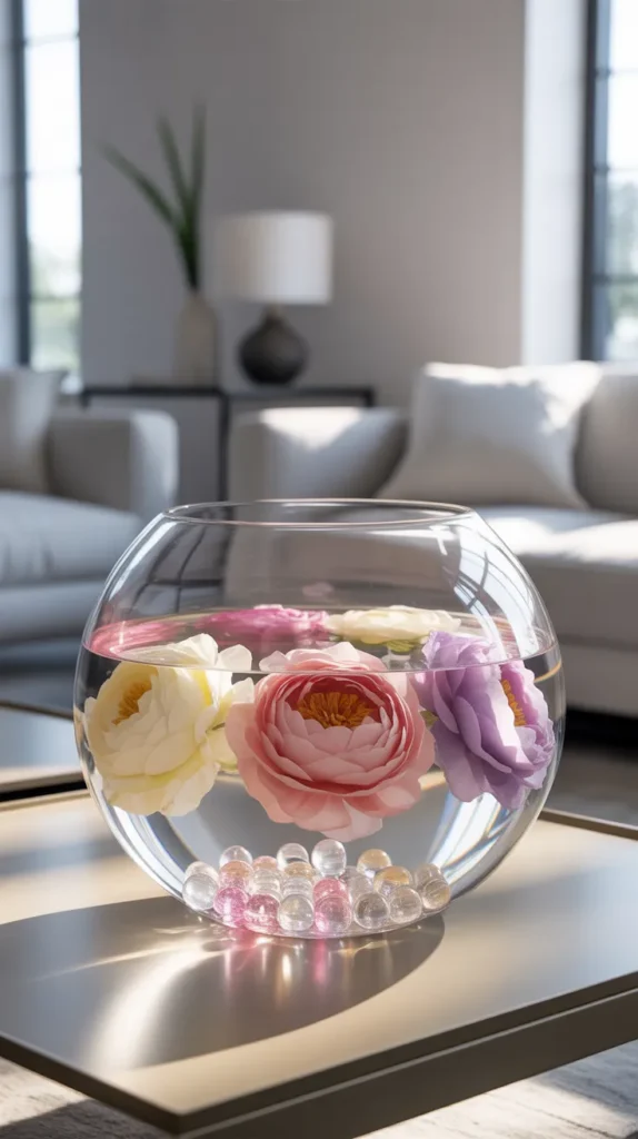 For a whimsical twist, place artificial flower heads in a shallow glass bowl to create a floating floral illusion. Add faux water beads for extra shine. This design feels elegant yet playful and is perfect for coffee tables or entry tables.