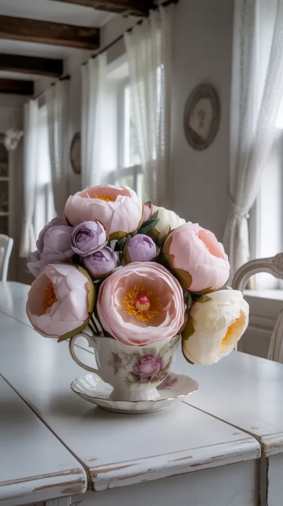 A pastel teacup artificial flower centerpiece brings a soft and romantic touch to your table. Use faux peonies, mini roses, and baby’s breath arranged inside vintage-style teacups. This idea works beautifully for brunch tables, spring decor, or small apartment dining spaces.