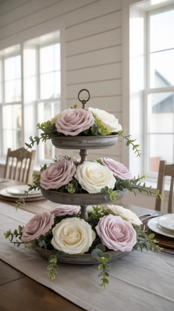 A tiered tray decorated with artificial flowers adds height and interest to your table. Combine faux roses, greenery, and small decorative items for a layered look. This centerpiece works especially well for seasonal decorating.
