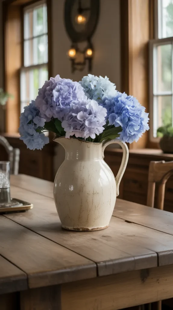 Use a vintage-style pitcher filled with artificial hydrangeas or roses for a cottage-inspired centerpiece. This look feels welcoming and timeless.