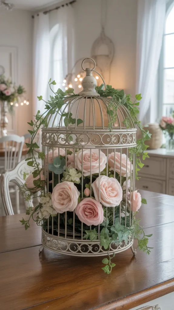 Fill a decorative birdcage with artificial flowers and trailing greenery for a romantic table centerpiece. This design adds height and visual interest.
