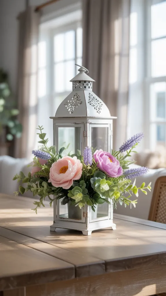 Place artificial flowers inside a decorative lantern for a charming table statement. Mix pastel blooms with trailing greenery for a soft romantic style. This centerpiece is perfect for both indoor and outdoor tables.