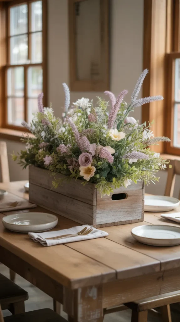 A wooden box filled with artificial wildflowers creates a cheerful, garden-inspired table centerpiece. Mix daisies, lavender, and greenery for a relaxed farmhouse look. This arrangement works well on long dining tables or console tables.