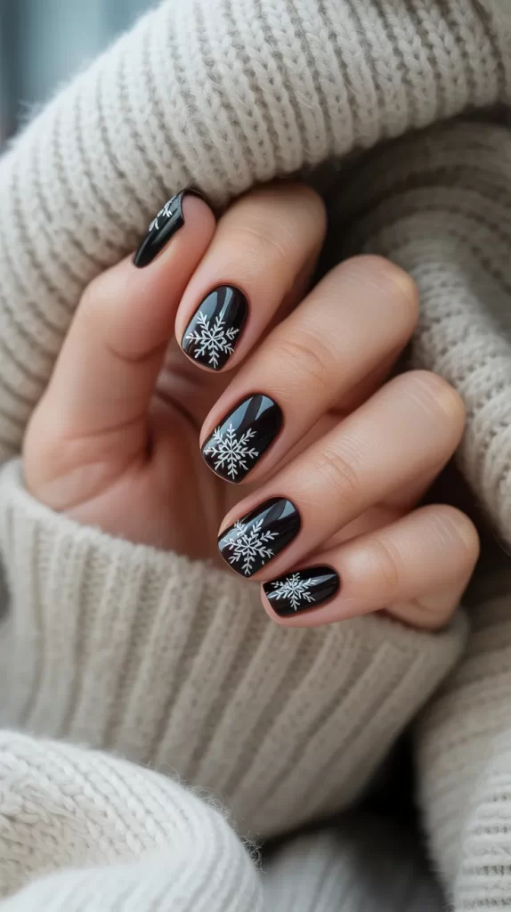 For a bold contrast, try black nails with white snowflake designs. The dark base makes the snowflakes stand out dramatically.