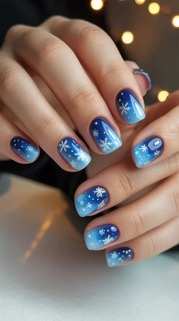 Blend light and dark shades of blue into an ombre gradient, then decorate with white snowflakes. This creates a smooth transition that looks like a snowy sky. The result is soft, dreamy, and peaceful.