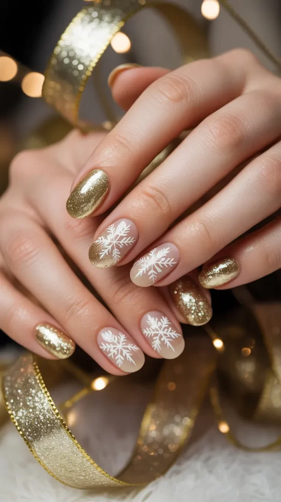 Add holiday luxury with a gold base and white snowflake accents. The golden shimmer gives warmth, while the snowflakes bring that festive winter feel. Together, they create a glamorous Christmas-ready look.