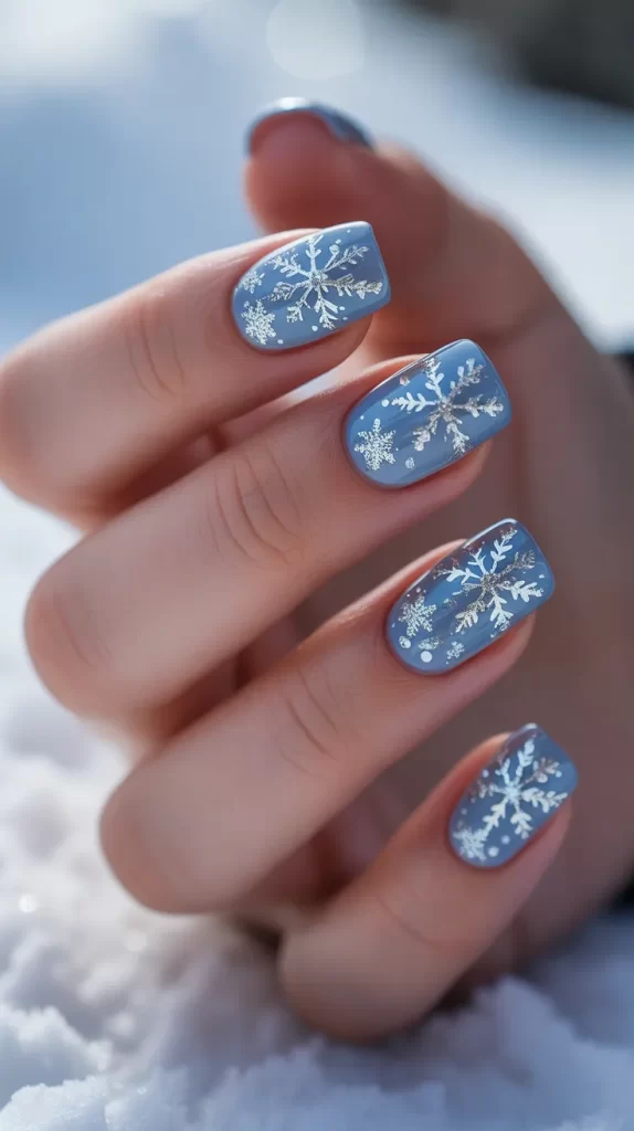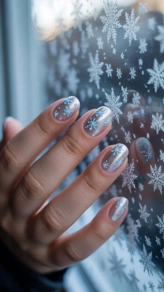 A mix of silver and icy blue polishes creates a frozen wonderland effect. The snowflakes blend naturally into the shimmer, resembling a frosty sky.