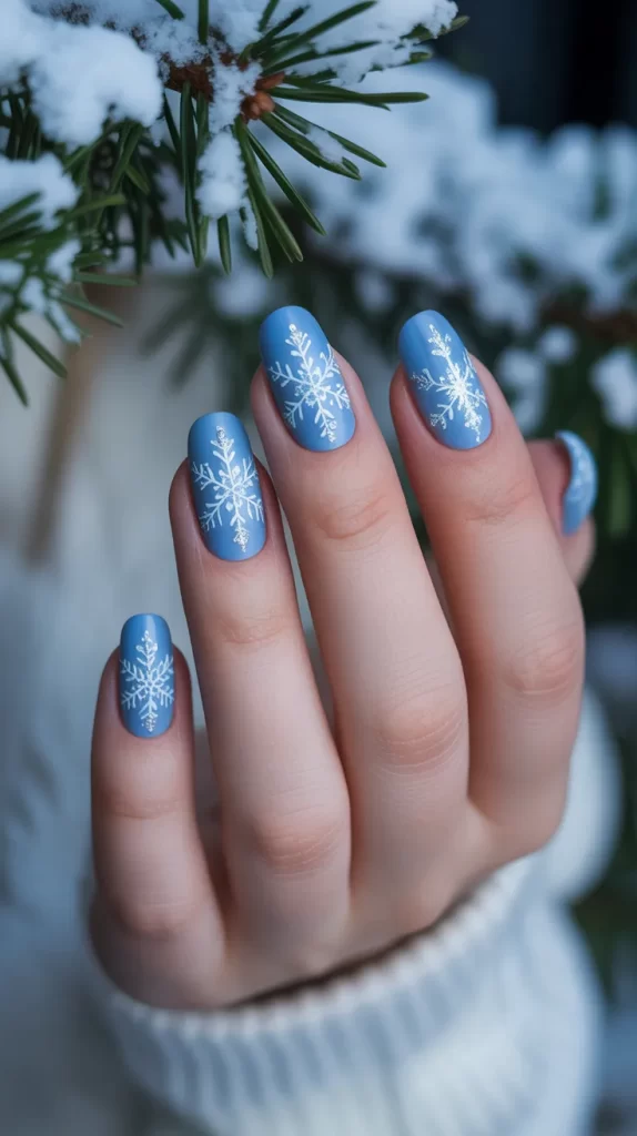 Matte blue nails with white snowflake designs give off cool, frosty vibes. The matte texture softens the shine, making the snowflakes pop beautifully.
