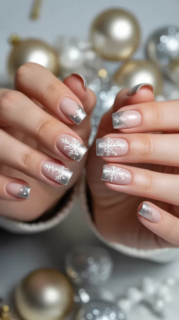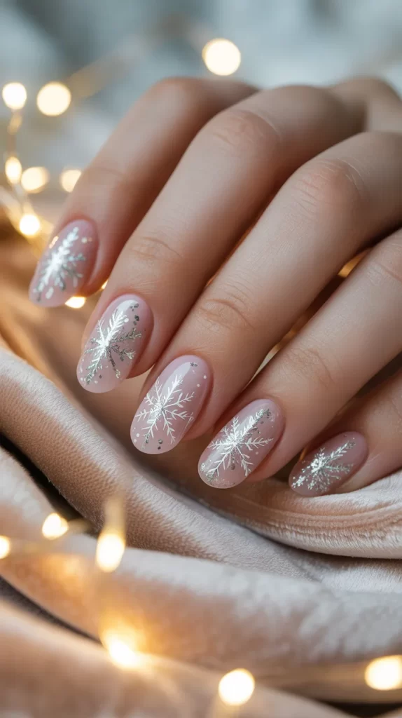 Soft pink nails with silver glitter and white snowflakes offer a girly, elegant holiday style. The pink adds warmth, while the snowflakes make it feel festive.
