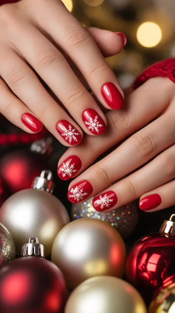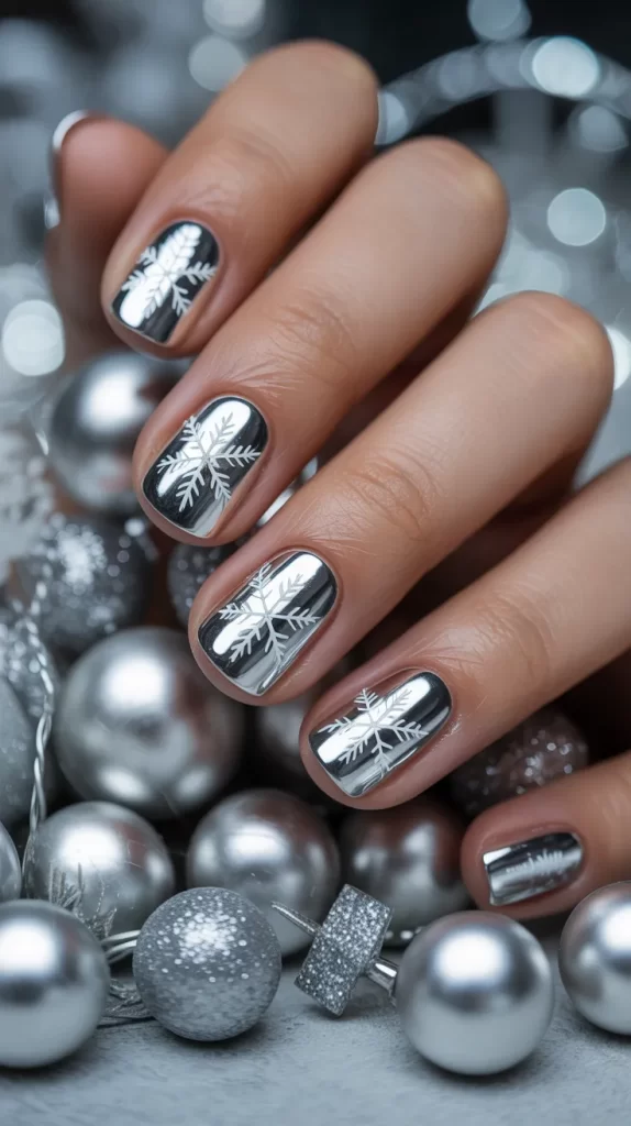 Silver chrome nails paired with white snowflakes create a futuristic, icy vibe. The metallic shine reflects holiday lights, giving your nails a mirror-like glow. It’s bold, modern, and festive.